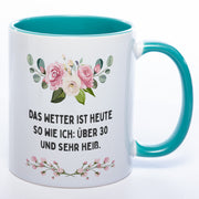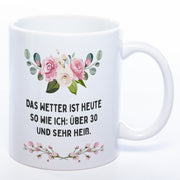 Blümchen-Tasse mit Spruch "Das Wetter ist heute so wie ich: Über 30 und sehr heiß." - Lustige Kaffeetasse spülmaschinenfest
