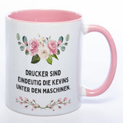 Blümchen-Tasse mit Spruch "Drucker sind eindeutig die Kevins unter den Maschinen." - Lustige Kaffeetasse spülmaschinenfest