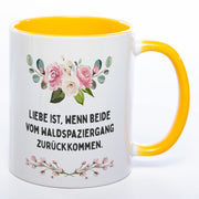 Blümchen-Tasse mit Spruch "Liebe ist, wenn beide vom Waldspaziergang zurückkommen." - Lustige Kaffeetasse spülmaschinenfest