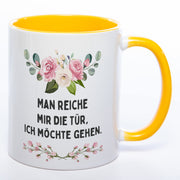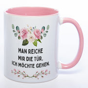 Blümchen-Tasse mit Spruch "Man reiche mir die Tür, ich möchte gehen." - Lustige Kaffeetasse spülmaschinenfest
