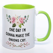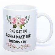 Blümchen-Tasse mit Spruch "One day I'm gonna make the onions cry." - Lustige Kaffeetasse spülmaschinenfest