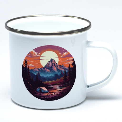 Vollständige Details anzeigenEmaille-Tasse mit Campingmotiv Zelt, See und Berge Motiv 5