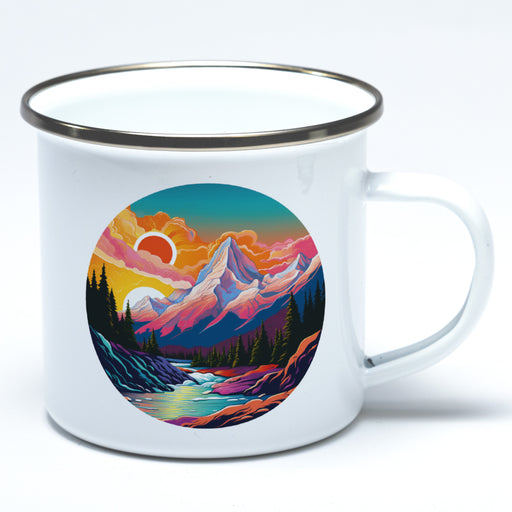Vollständige Details anzeigenEmaille-Tasse mit Campingmotiv Fluss und Berge