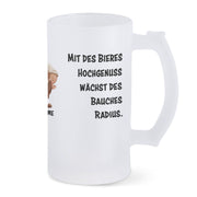 Bierkrug aus satiniertem Glas mit Motiv, Spruch und Wunschname: Mit des Bieres Hochgenuss wächst des Bauches Radius