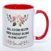 Blümchen-Tasse mit Spruch "Soll ich Dir helfen oder kriegst Du das alleine kaputt?" - Lustige Kaffeetasse spülmaschinenfest