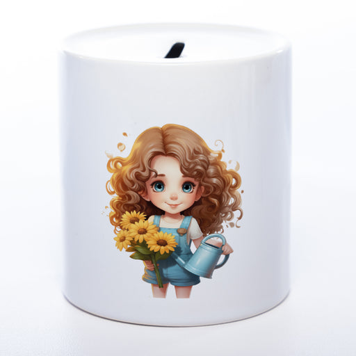 Hochwertige Spardose aus Keramik mit süßem Blumenmädchenmotiv und Wunschtext | Geschenkidee