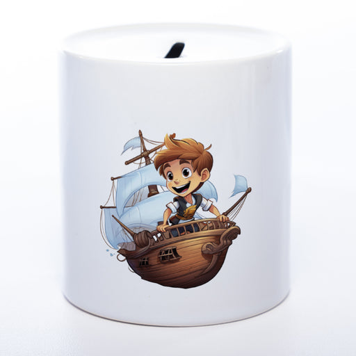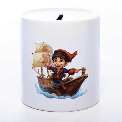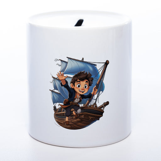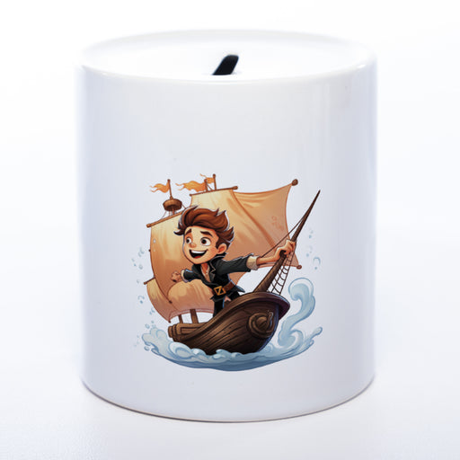 Hochwertige Spardose aus Keramik mit kleinem Piraten-Kapitän und Wunschtext | Geschenkidee