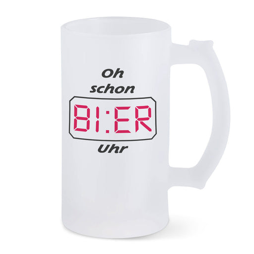 Bierkrug aus satiniertem Glas mit Motiv und Spruch: Oh schon BI:ER Uhr