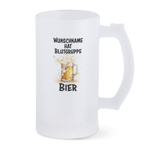 Bierkrug aus satiniertem Glas mit Spruch: ... NAME... hat Blutgruppe Bier